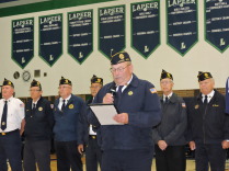 Commander Walt Stewart reprsentative from American Legion Post 16 presented the freshman team with a certificate of appreciation for patriotism.The team gained national attention after they sang the National Anthem when there was not going to be a National Anthem before the game at Carman - Ainsworth. (Photo circa 2016)
